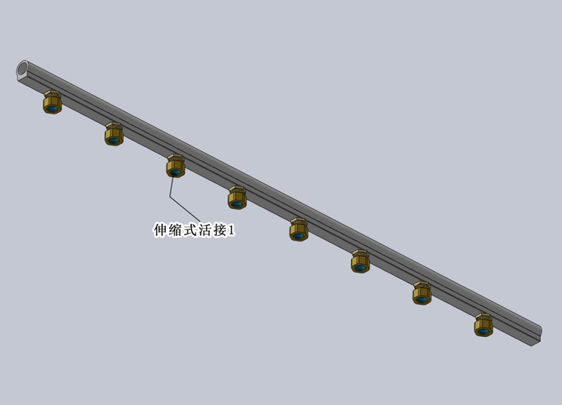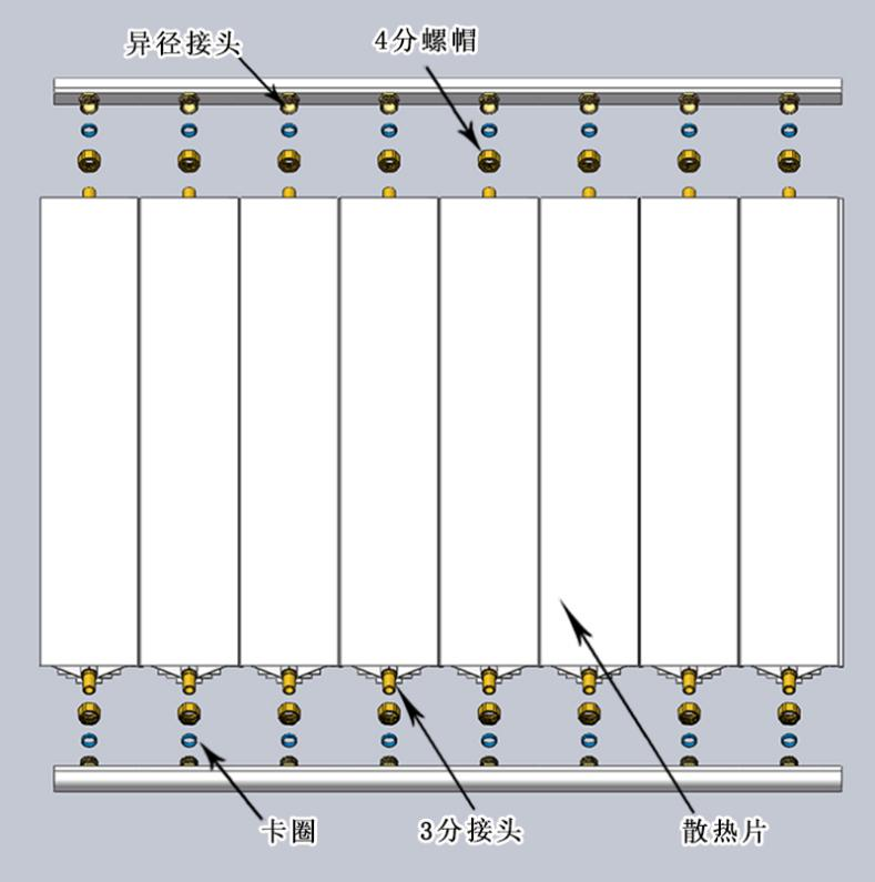 a、每支散热片根据需要已切割相应长度,两头都攻好丝,并且已将伸缩式活接的3分接头装配在散热片的两头,详见下图: