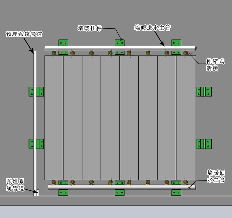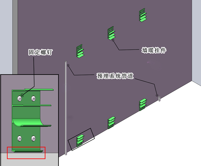 将墙暖散热面向外,上墙安装到挂件上,下主管安装在下挂件中间卡槽内,上主管安装在上挂件中间的卡槽内。