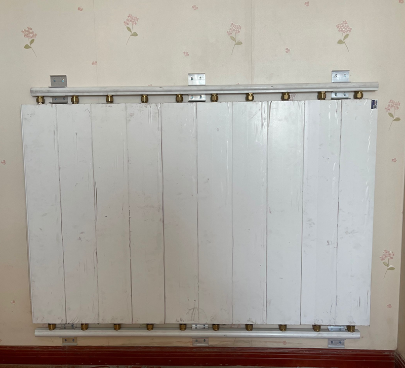 1、先根据预留系统管道的位置确定墙暖安装的准确位置,然后在左右两边第一和第二片散热片之间分别固定一只挂件。