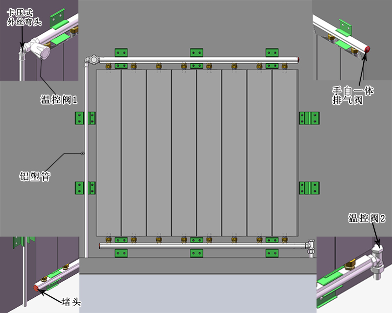 三、与系统管道的对接及温控阀、排气阀、堵头安装