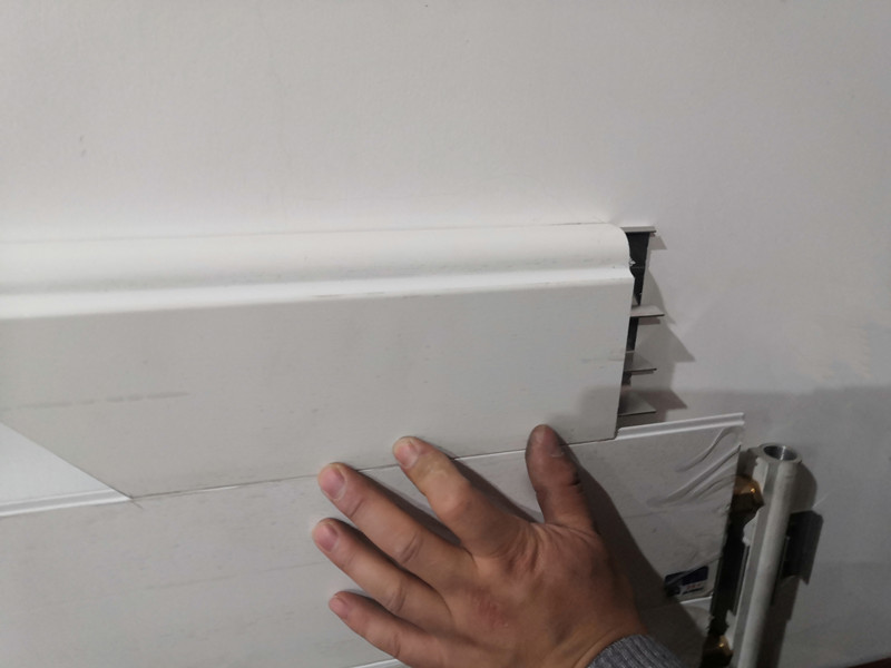 系统管道是预先暗埋在地板或瓷砖下,弯上墙时,踢脚线后开槽通过,不要封槽,踢脚线上布置在墙面外边,不要暗埋墙内。管道要沿着和墙面水平方向的地面开槽一段距离到定位处,然后再向上弯曲定位,不要垂直墙面开槽布管。