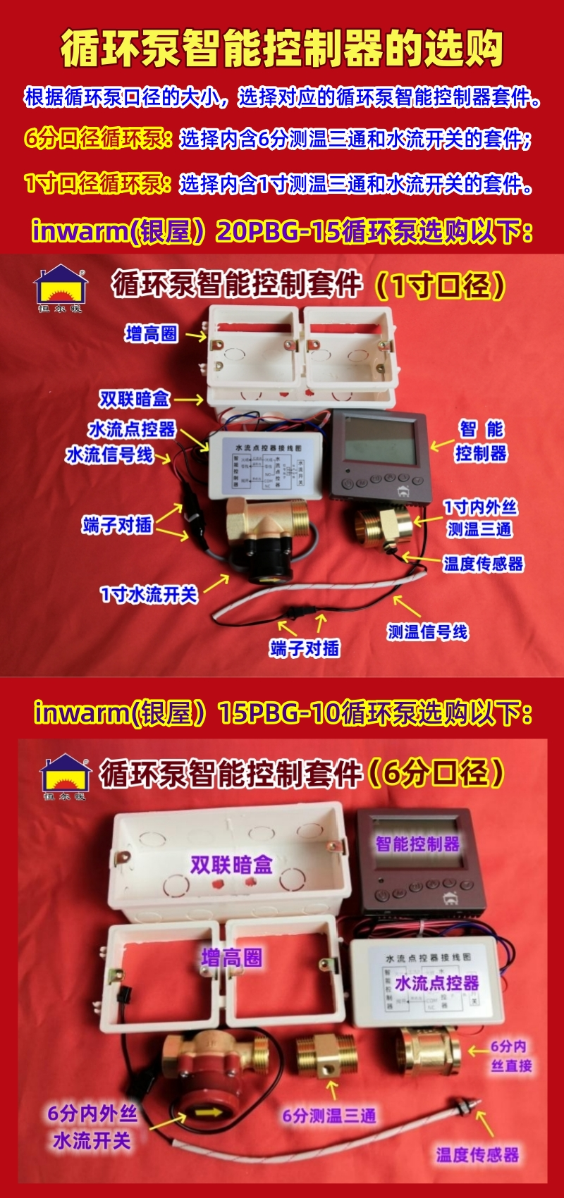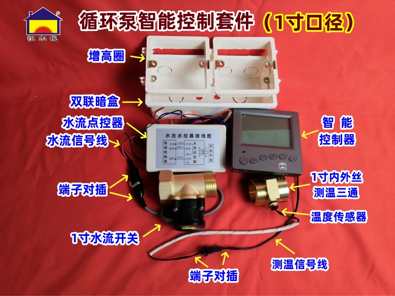 根据循环泵水口的大小,恒暖公司设置了2种智能控制套件,分别为: