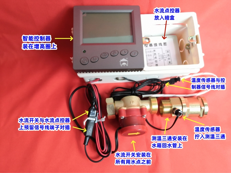 将水流开关安装在所有用水点之前,如水箱的出水口处,将测温三通安装在最后用水点和水箱的回水口(入水口)之间;如果循环泵也安装该处,就安装在循环泵的入水口上,将温度传感器,安装到测温三通中间的测温口上;