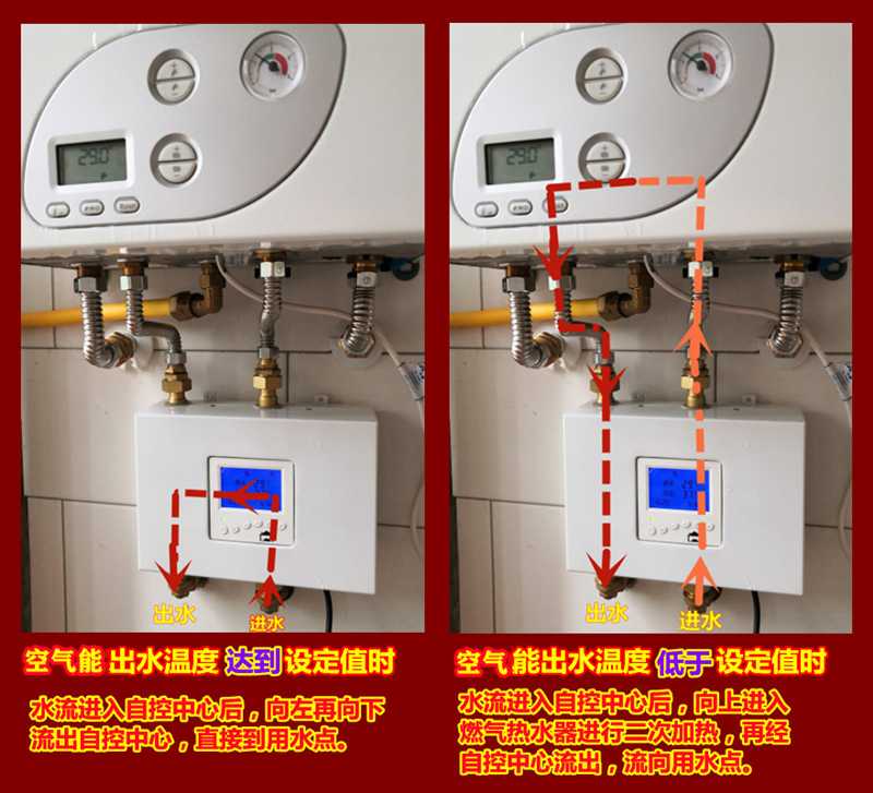 1、从空气能水箱出水口引管至燃气热水器处,接入恒尔暖自控中心的右下口。