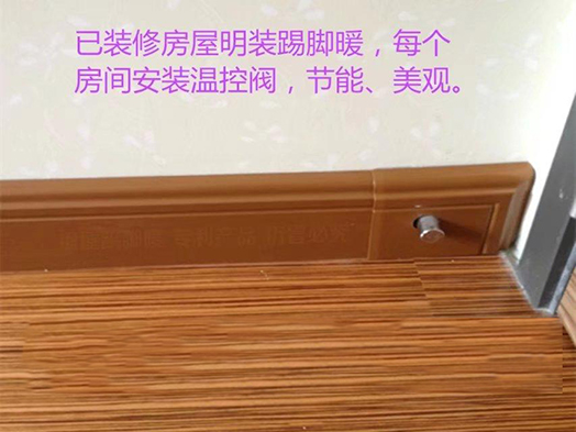 踢脚暖明装时,可以用铝塑管做为供暖管道,采用双管并联同程方式(面积小的房子也可采用双管异程方式),供暖主管可以沿着踢脚暖后面从每个房间的外墙内侧布置,也避免了管道通过室内门的困扰,而且每个房间可以安装上银屋暖通国际特制的温控阀,温控阀隐藏在踢脚暖后面,外面只能看到一点调节帽,不仅达到分室控制,而且十分美观。