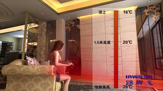 大家都知道,地暖从下面向上加热,脚暖头凉,舒适度高。而Inwarm踢脚暖具有同样的效果,由于踢脚暖安装在房间的四周墙面与地面的连接处,供暖时,从四周向中间辐射散热,人的脚部迅速感觉到温暖,不仅和地暖具有同样的舒适度,而且比地暖更加健康,不会像地暖那样扬尘,也不会像地暖那样加速强化地板或实木复合地板里的甲醛等有害物资的迅速挥发对人体造成伤害。
