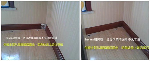 Inwarm踢脚暖外观和实木踢脚线一样,同时具有供暖功能,材质采用散热极快的铝合金,供暖效果比普通暖气片和地暖都要好,而且十分节能,比普通暖气片节能20-30%,比地暖节能60-70%,安装又十分方便,只要将家里原来的瓷砖或实木踢脚线拆除换上踢脚暖即可。而且它的优点是,从热源到每个房间的供暖主管可以从踢脚暖后面走,墙面上根本看不见那些难看的供暖管道了。同时踢脚暖又有各种颜色,可以和地板和谐搭配。可以说,Inwarm踢脚暖是老房明装完美的供暖方式。