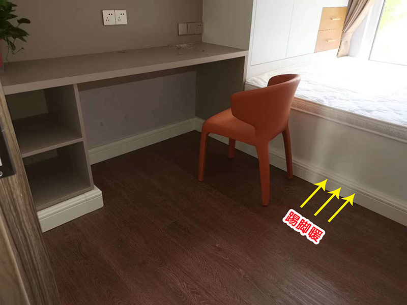 卧室的踢脚板采暖像踢脚线一样围绕房间一圈安装,从地面四周向中间辐射散热,升温迅速,只需要十几分钟就能让房间达到理想温度,能够实现间歇供暖。