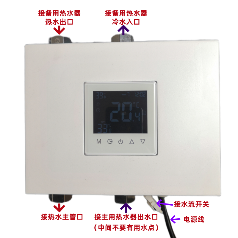 恒尔暖自控中心的安装也很简单。四个水口简单对接一下就可以了。右下口利用管道接主热水器出水口,这个中间不要有用水点,左下口接热水主管,右上口接备用热水器冷水入口,左上口接备用热水器热水出口。