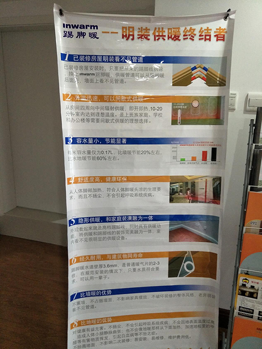 上面这张是在他们展厅拍的X展架踢脚暖的介绍,不知道大家能不能看清字,供参考。
