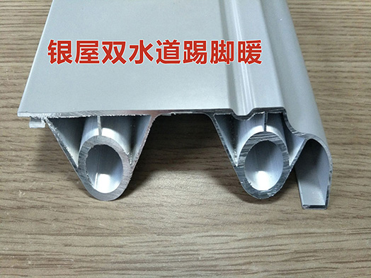 双水道踢脚暖,如下图,这种是在单水道的基础上经过改进,面板后面布置2根水道,每个水道分别通过3个翅片共计6个翅片与面板连接,如下图,这种结构的踢脚线暖气片热传导比单水道的更好,散热量更大。