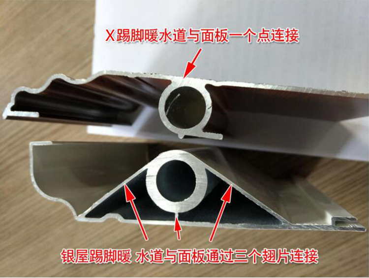 银屋新款单水道踢脚暖,水道和面板之间是通过3个翅片连接,结构合理,热传导快而且均匀,散热量高,供暖效果好。
