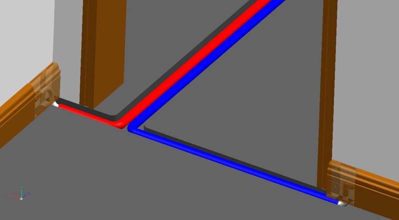 第一种情况,针对新房毛坯房也包括老房翻新重新铺设地面装饰材料的房子,踢脚暖安装时,不用考虑过门的问题,这是因为采用的是铝塑管和分水器章鱼式采暖系统,系统管道是暗埋在地板或瓷砖下面,施工时从地上开槽,从分水器到每个房间的一进一回两根管道,先将管道预留到每个房间门两边,在墙面和地面装修好,再装踢脚暖,然后踢脚暖两头端口与预留的系统管道对接即可,根本不用考虑过门的问题。