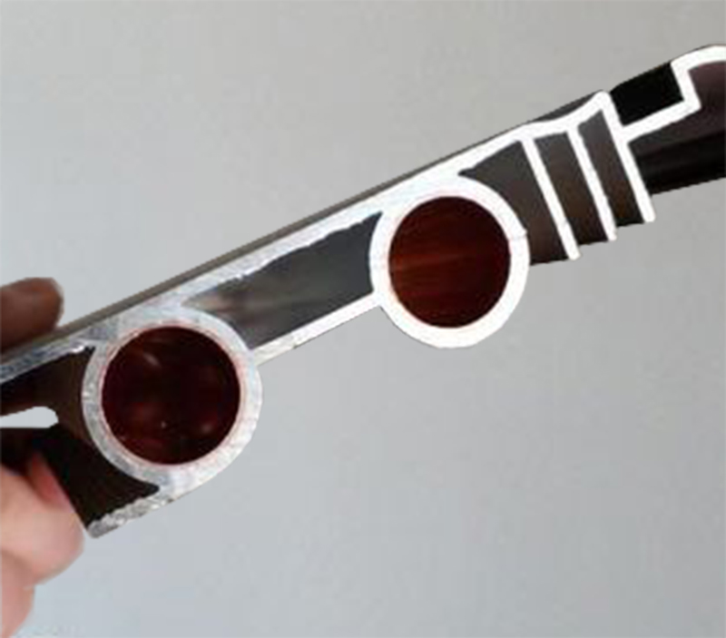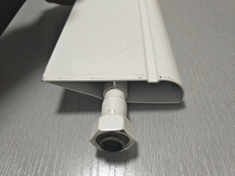 如果有的是在工厂里预先将踢脚暖里面穿好紫铜管并胀接好,每根长度5-6米,在客户家现场安装时,再根据墙面长度直接将踢脚暖外面的铝型材和里面的紫铜管一起切割掉,然后在水道口倒角,用铜配件套上橡胶密封圈进行连接。做成铜铝复合的目的是为了耐腐蚀延长使用寿命,这样的安装方式,不仅达不到延长使用寿命的目的,而且严重缩短踢脚暖的使用寿命,这是为什么呢?这是因为踢脚暖水道端口倒角后紫铜管和铝合金连接处一起浸入了水里,在热水里就会产生较为严重的电化学腐蚀,导致连接处的紫铜管和铝型材水道被腐蚀的很快,使用寿命比纯铝合金水道要低很多。