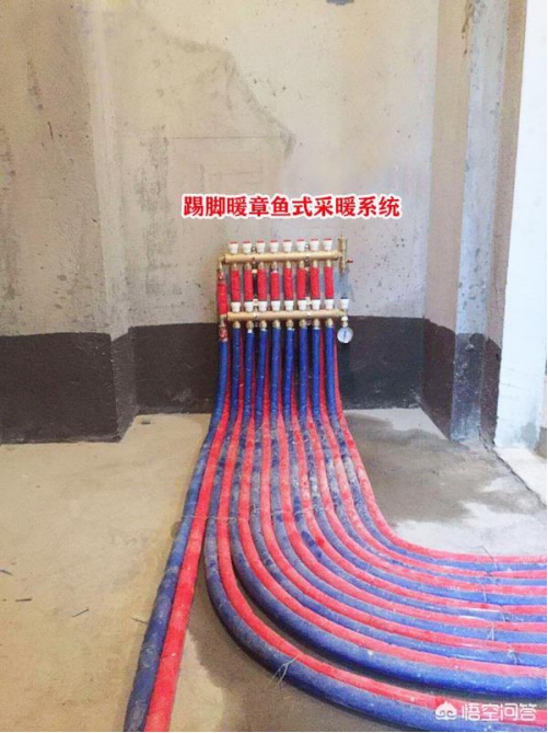 从热源接出2根供暖主管,通到集分水器,然后从集分水器到每个房间的暖气片或踢脚暖再布置2根进回水支管,支管从集分水器处向四周分散,看起来像章鱼的触角向四周延伸,因此供暖行业形象的叫这种采暖系统为章鱼式采暖系统,这种采暖系统只适合毛坯房或地上可以开槽的房子安装。
