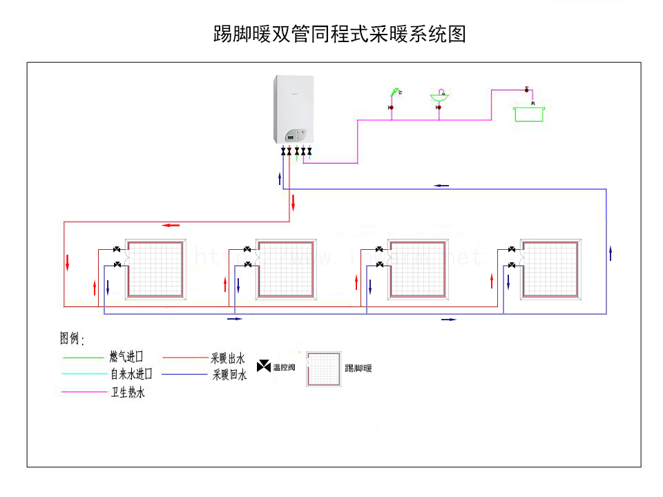从以上示意图可以看出,供暖进水主管和回水主管并排前行,到每个房间时分别通过三通接出支管与这个房间的暖气片或踢脚暖的进回水口相连,越靠热源的暖气片或踢脚暖的进水管(主管加支管)加上回水管(主管加支管)的合计长度越短,系统阻力越小,越远离热源的越长,系统阻力越大,因此这种采暖系统不好调节水力平衡,一般只适用于面积较小的房型,面积较大的房型最好不要采用这种异程式采暖系统,以免调节不好。