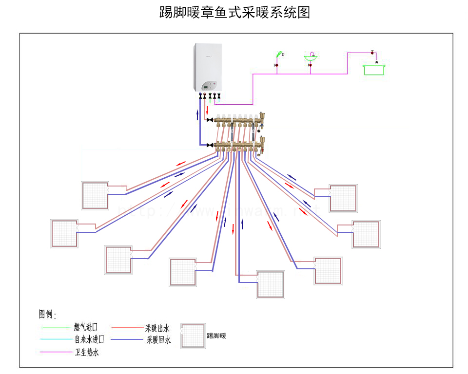 第四点、与采暖系统不同有关。在相同的热源和供暖终端情况下,常用的双管并联采暖系统耗能较高,章鱼式采暖系统耗能较低。一般双管并联采暖系统由于都是用PPR管,供暖主管用Ø25的,管道外径较大,一般埋在地下再做保温就更粗了,所以PPR管双管并联系统一般管道不做保温,这样供暖时,热量向地板下混凝土的散发较大,因此耗能高,再加上由于是双管并联系统,即使只开一个房间的供暖终端,热水也要经过所有房间的供暖主管流过,因此热损失很大;而章鱼式系统采用铝塑管和分水器作为系统材料,一般分水器放在厨房或卫生间,从分水器到每个房间供暖终端是单独的2Ø16的铝塑管,一般外面全部做上保温套管,供暖时,热水只流到这个房间,不到其他房间,因此热损失较小,这就是为何章鱼式系统比双管并联系统节能的原因。
