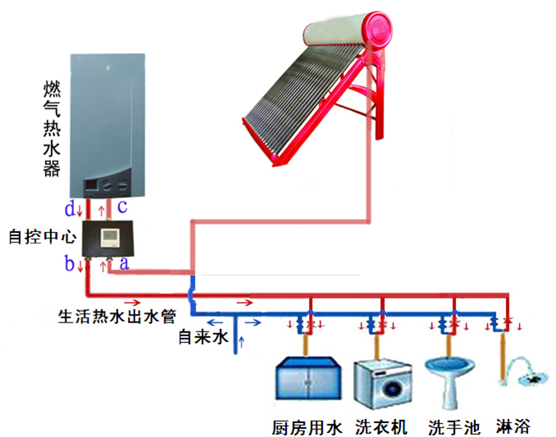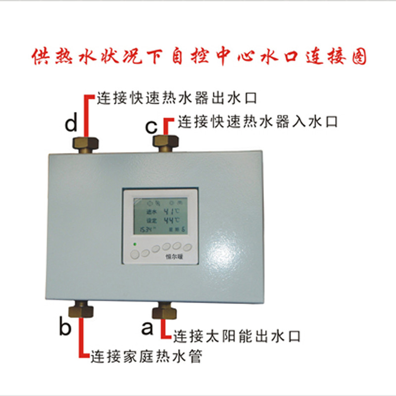 为解决上述所说的问题,合肥恒暖暖通设备有限公司发明了“太阳能+快速热水器自控中心”。该自控装置能用户在使用热水时,根据设定水温与实际水温的对比,智能切换太阳能热水器与快速式热水器(燃气热水器、燃气壁挂炉即热式电热水器),在太阳能热水器的出水水温能够达到设定温度时,不开启快速式热水器,当太阳能出水温度达不到设定温度时,自动开启快速式热水器,这时太阳能热流出来的水再通过快速式热水器进行二次加热这样既节能又十分方便,无需再人工手动操作。