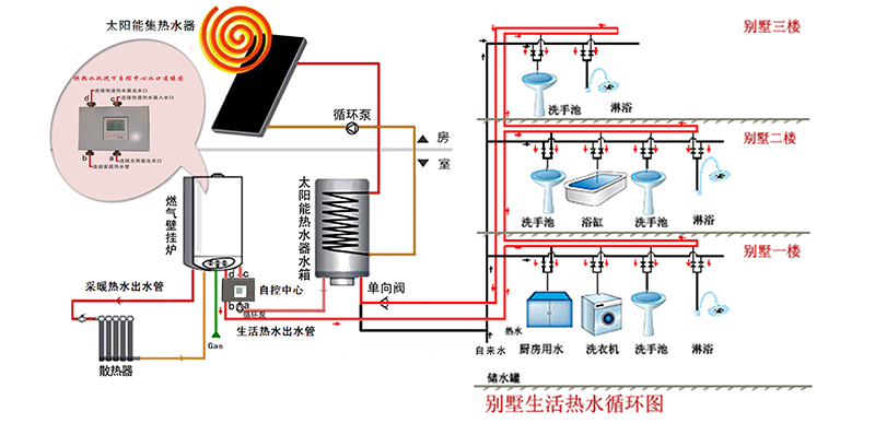 (别墅承压式太阳能+燃气壁挂炉+恒尔暖自控中心智能热水循环系统