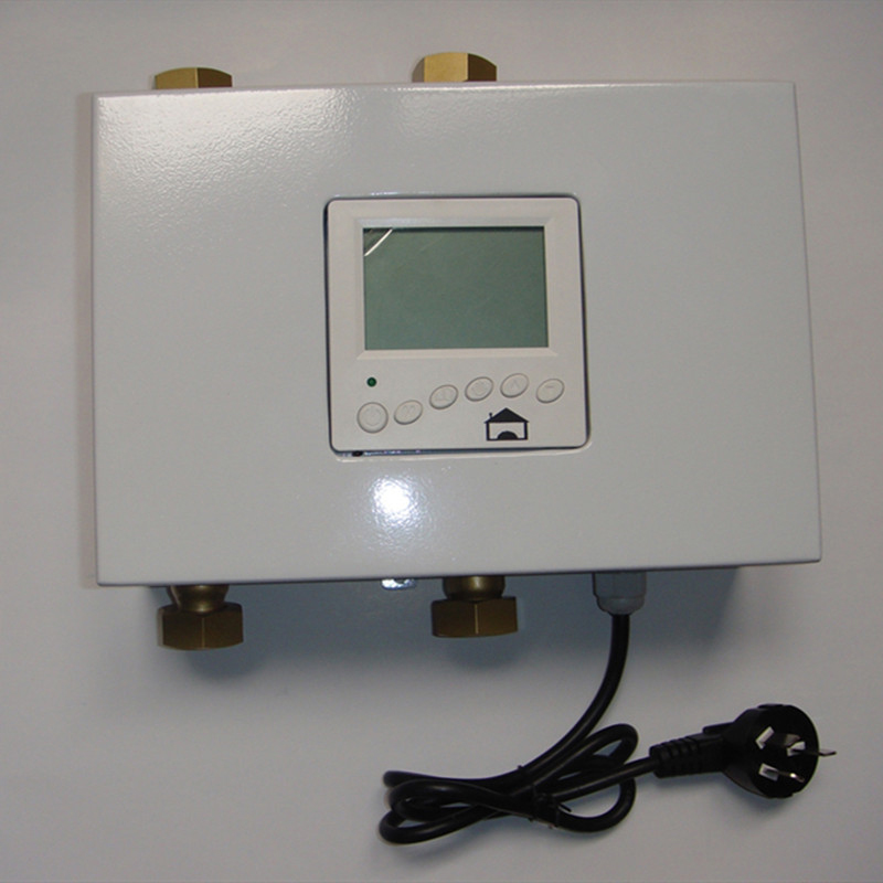 自控中心由电动三通阀、温度传感器、温度控制器、连接铜管管件和外壳组成,水温传感器直接插入水中,使测量的温度更精确,温度控制器具有较大的液晶显示屏,可以显示设定温度、实际温度、工作模式、日期和时间等。自控中心具有手动模式和定时自动模式,人工开机默认为手动模式,通过按键“▲”设定增加温度,通过按键▼”设定降低温度,操作十分简便;定时自动模式,每天可分为四个时间段,每个时间段可设定不同的水温,模式设定后,温控器按照所设定的时间有规律地自动开机和关机,既节能又方便提高生活舒适度,同时又延长自控中心的使用寿命。