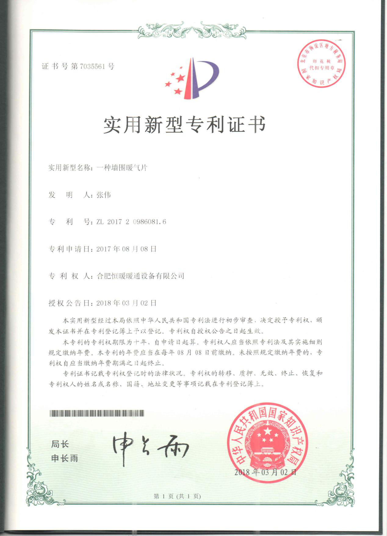 银屋暖通国际的研发团队经过多年的潜心研究,在银屋薄型墙暖的散热片结构、安装方式、连接配件等方面先后获得中华人民共和国国家知识产权局颁发的8项专利证书。到目前为止,在全球范围内还没有发现同类产品。
