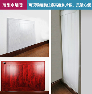 从上面的超薄墙围式采暖散热器片安装照片可以看出,它四周紧贴墙面没有一点缝隙,厚度很薄,几乎不突出墙面,外形美观大方,可以整面墙安装,也可以局部安装,如果选择白色,就和白色墙面浑为一体,根本看不出是供暖设备;如果选择上面图片的水曲柳颜色,或者苹果木等木纹颜色,还可以当着护墙装饰板使用,将供暖、装饰和保护墙面有机融为一体,是十分理想的装饰性暖气。