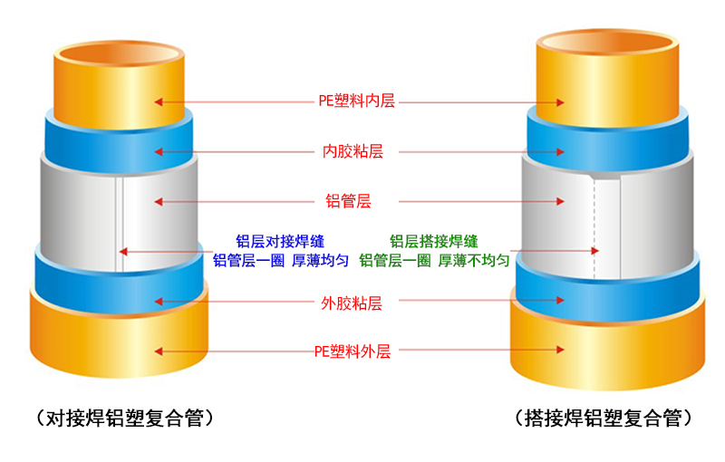 (搭接焊铝塑管和对接焊铝塑管结构对比图)