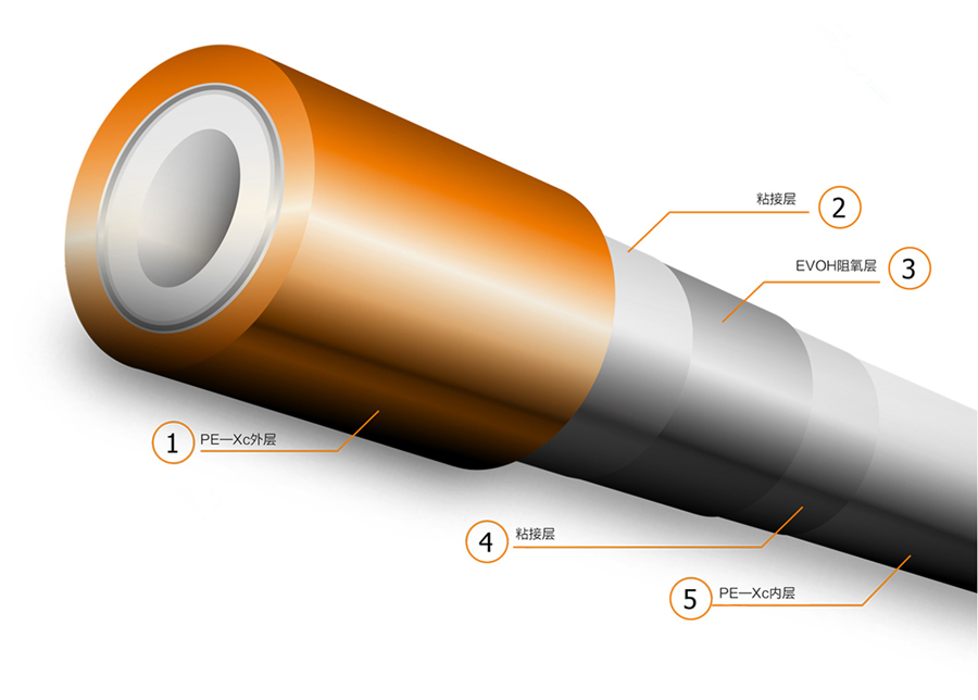 这种是在塑料管管壁中间增加一层铝层,加上两边的粘接层,共计5层。增加的铝层不仅更好的阻止氧气进入管道内,也具有金属管的特性,耐压、耐高温、易弯曲,不回弹,不易老化开裂,大大延长使用寿命。