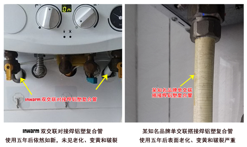 (二型双交联对接焊铝塑管与一型单交联搭接焊铝塑管的对比图)