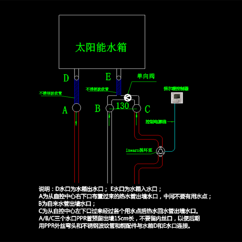 在该设计方案中,自控中心右下口到太阳能水箱出水口之间的管道不要有用水点。如果太阳能水箱只有两个进出水口,没有回水口,热水循环管经过最后一个水点后,和自来水管一起通过三通与太阳能水箱的冷水进口连接,在热水管和三通之间安装止回阀,防止自来水流到热水管。