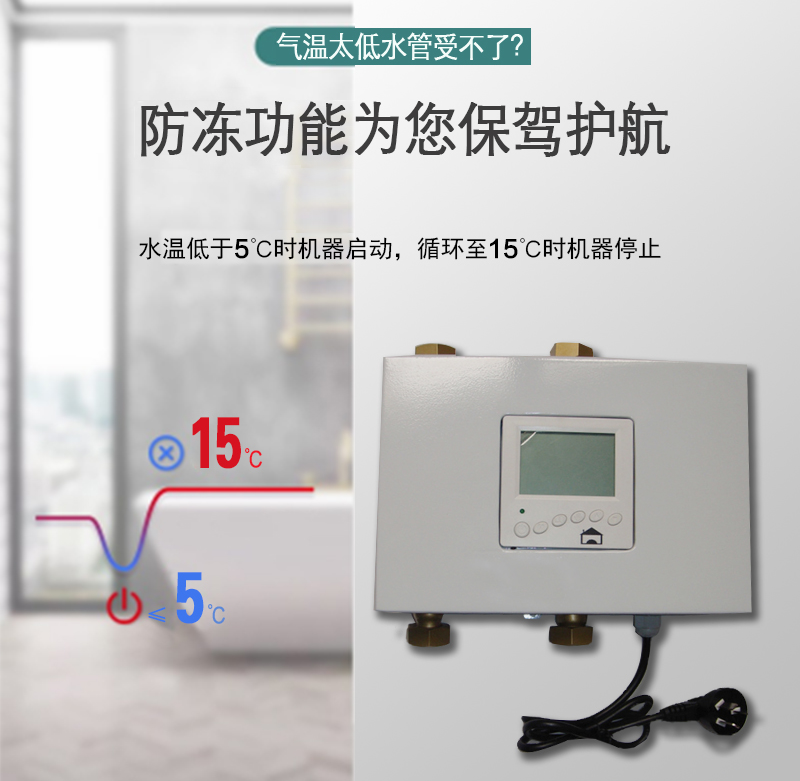7、还具有低温防冻功能,恒尔暖自控中心和热水器循环泵控制器均具有地方防冻功能,当水温低于5°C时自动开启循环,达到15°C时停机,避免了冬天气温低热水管道冻坏的风险。