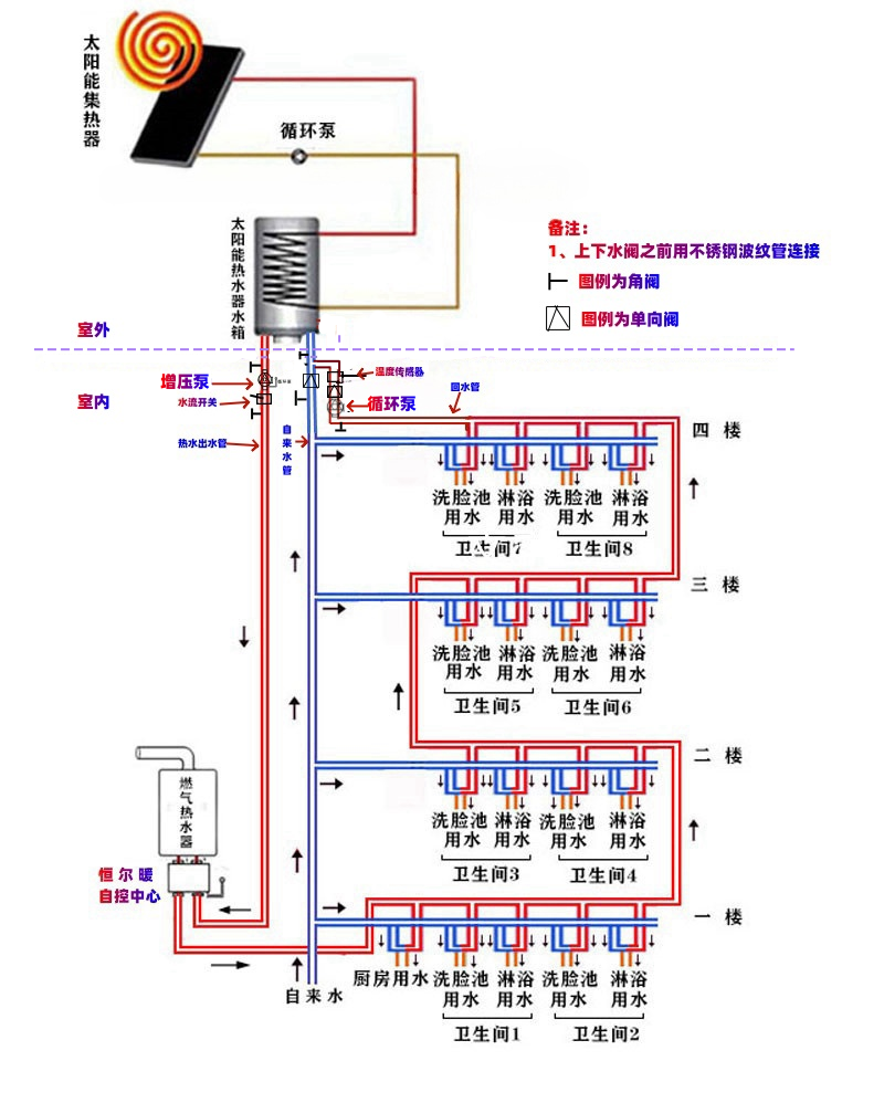 4、双热水器组合(零冷水):在上述基础上,最远用水点回水管接主热水器水箱入水口,循环泵装储水式热水器处,回水不得接入备用机(避免频繁启动耗能)。