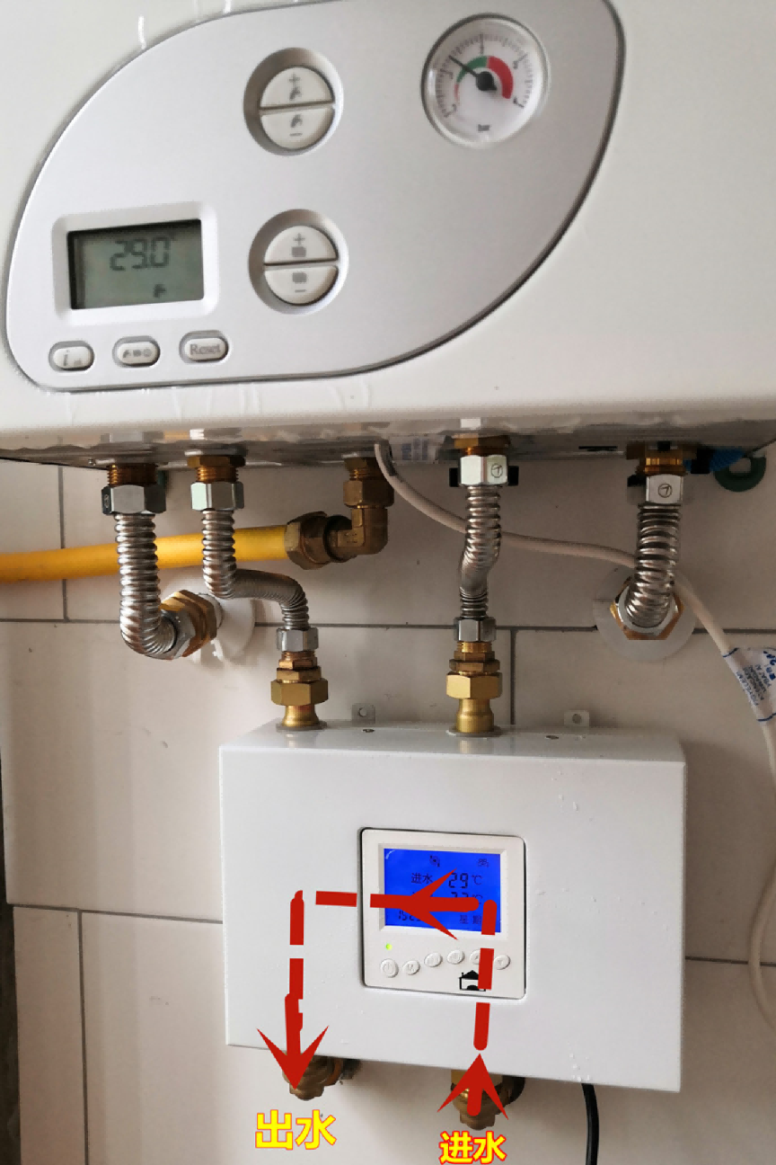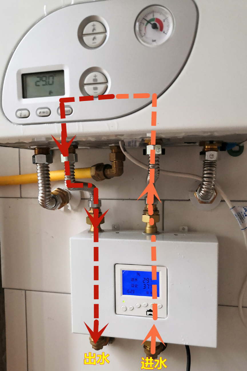 恒尔暖自控中心需安装在燃气热水器处,其管道连接与工作逻辑如下: