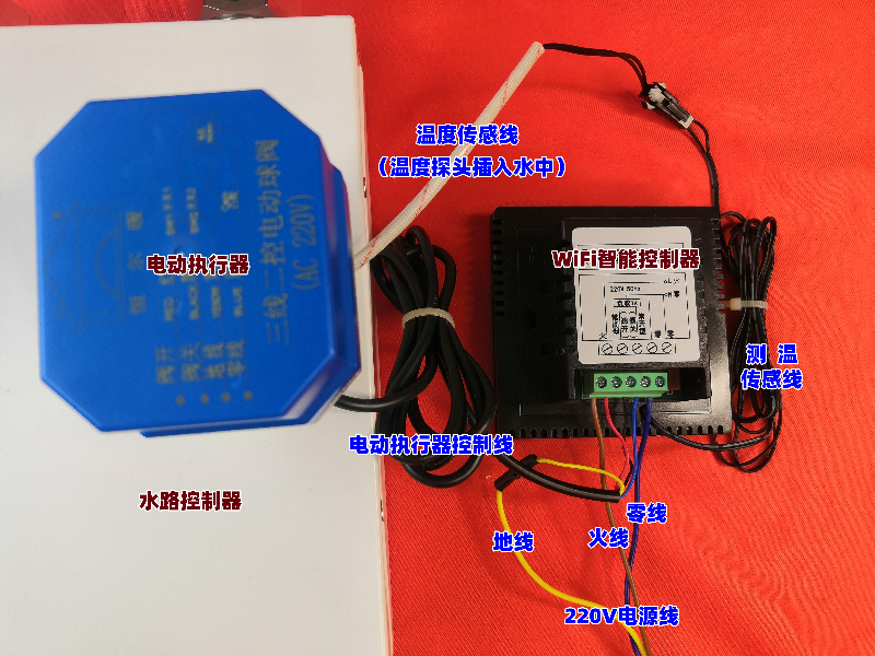 安装时,给智能控制器 220 伏供电,火线接火线端子,零线接零线端子;电动执行器黄色线接电源接地线,红色线接阀开端子,黑色线接阀关端子,蓝色线接零线端子;智能控制器测温传感线插头与控制盒内温度传感器接线插头对接。